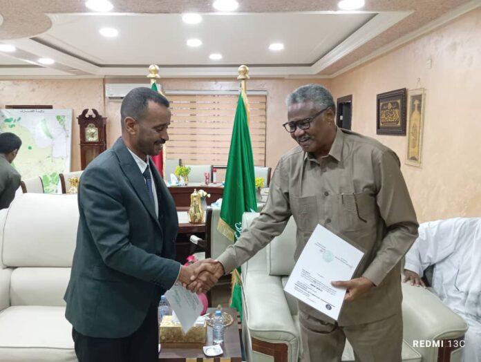 استجابة لنداء دعم المتضررين من السيول والفيضانات بمحلية الرهد تسلم والى القضارف الفريق الركن محمد احمد حسن لدى لقائه اليوم الاستاذ فتح الرحمن عوض السيد مدير بنك التضامن الاسلامى عدد (٢٠٠) جوال ذرة دعماً لقرى محلية الرهد .