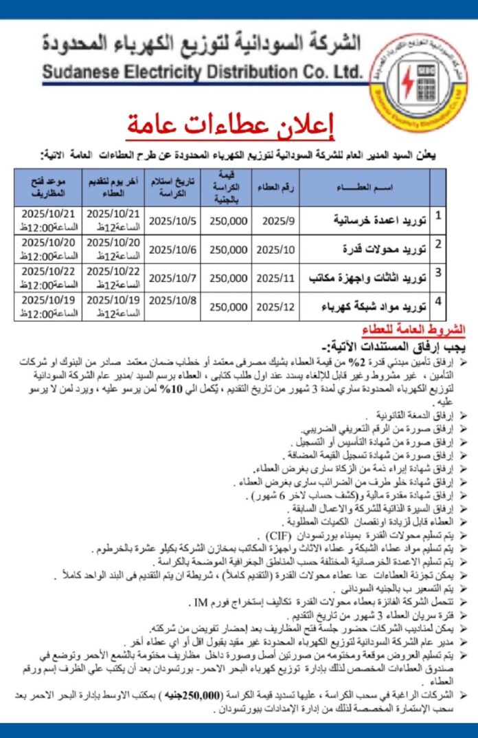 الرئيسيةمنوعاتاعلان عطاء. ... منوعات اعلان عطاء. يعلن المدير العام للهيئة القومية للكهرباء عن العطاء العام الموضح في الجدول 0 28 أكتوبر 6, 2025 كتب بواسطة فريق المجد الإخباري شارك FacebookTwitterPinterestWhatsApp المادة السابقةاتفاق وشراكة بين شركة محجوب اولاد ووزارة الزراعة بنهر النيلالمقالة القادمةإنشاء الشرطة المجتمعية ضرورة حتمية في ظل الحكومة المدنية بقلم أ/ زكريا علي عبدالرسول مقالات ذات صلة منوعات ضد الانكسار أمل أحمد... أكتوبر 2, 2025 منوعات شيء من “الفن” عناقُ السحاب ... سبتمبر 30, 2025 منوعات من بريد الأسرة.. يكتبها/ علي بتيك. ... سبتمبر 27, 2025 الأكثر قراءة قصاصات وطنية .. بقلم... أكتوبر 14, 2025 صحة الخرطوم:محطة إنتاج مياه جديدة لمركز الكدرو لغسيل الكلى لاستيعاب مزيد من المرضى وزيادة السعة السريرية ل(٣٠) أكتوبر 14, 2025 جمعية تنظيم الأسرة السودانية تفوز بجائزة المؤتمر الدولي لتنظيم الأسرة للعام 2025 للتميز في القيادة والابتكار أكتوبر 14, 2025 صحة الخرطوم: استقرار ووفرة دوائية بمخازن وصيدليات مستشفيات الريف الشمالي لكرري وعلاج مجاني لضنك ل(٢٤)ساعة أكتوبر 14, 2025 تحميل أكثر احدث التعليقات