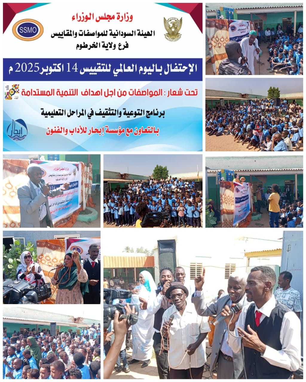 ضمن احتفالات الهيئة السودانية للمواصفات والمقاييس باليوم العالمي للمواصفات انطلقت صباحا من محلية ام درمان من مدرسة احمد بشير العبادي وسط حضور حاشد من تلاميذ المرحلتين الابتدائية والمتوسطة بقيادة مديري المدرستين والمعلمين ومشرفي النشاط الطلابي من محلية ام درمان .. فعاليات المواصفات تطرق كل باب بقيادة د. علي التماسيني حمد مدير فرع الهيئة السودانية للمواصفات والمقاييس ولاية الخرطوم وبحضور الأستاذة سلافة عبدالعزيز مدير وحدة ام درمان الكبرى بالفرع. الحملة القومية للتوعية وحماية المستهلك بالتركيز على المستهلك الصغير