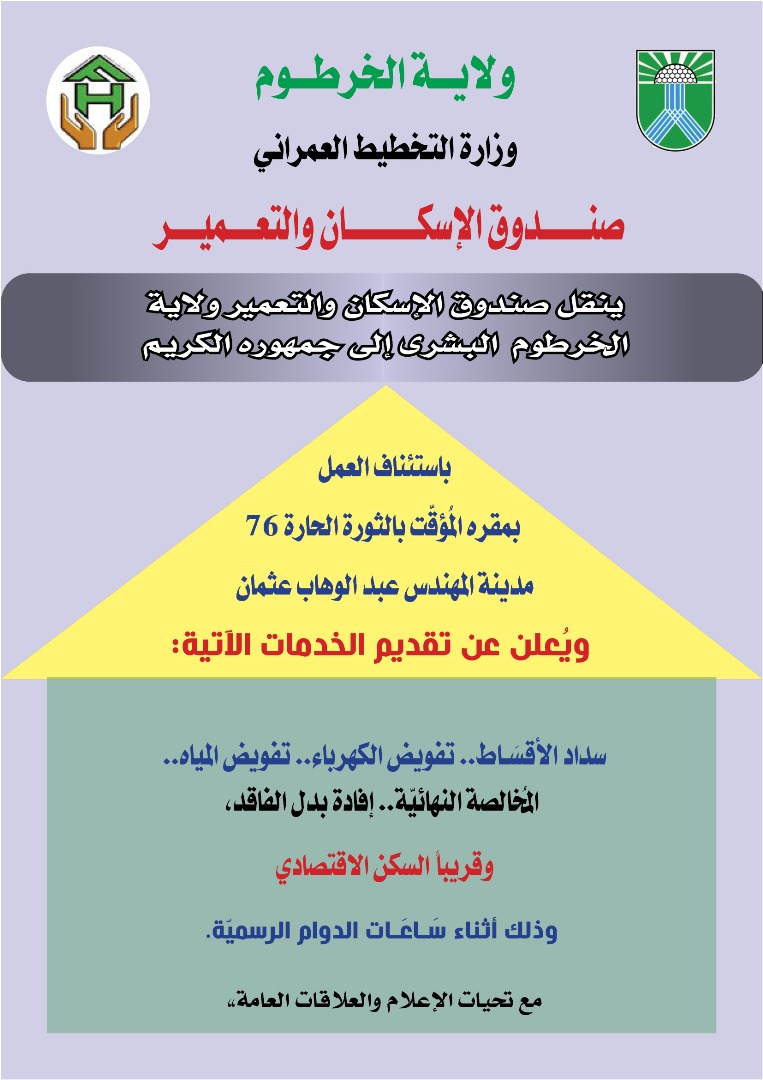 يعلن صندوق الاسكان والتعمير ولاية الخرطوم عن استئناف العمل بمقره المؤقت بالحار٧٦ امدرمان مدينة م. عبدالوهاب عثمان ويعلن تقديم الخدمات الاتيه:سداد الاقساط .. تفويض خدمات المياه والكهرباء.. المخالصات النهائيه.. الافادات(بدل فاقد)وقريبا جدا السكن الاقتصادى