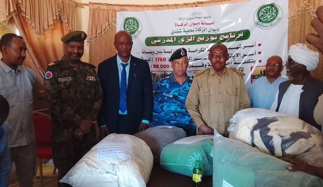 إلى ذلك دشن المدير التنفيذي لمحلية شندي خالد عبد الغفار الشيخ الزي المدرسي للطلاب الفقراء وأبناء شهداء حرب الكرامة بديوان الزكاة بشندي بحضور اللجنة الأمنية