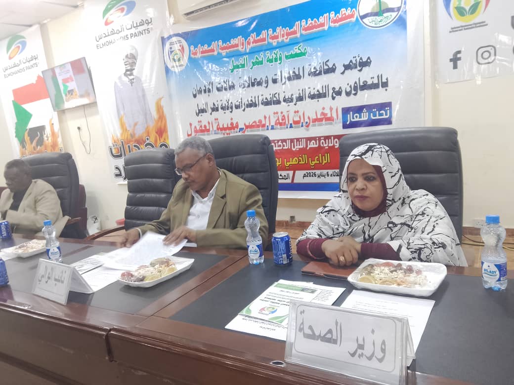 بدء أعمال مؤتمر مكافحة المخدرات ومعالجة حالات الإدمان الذي تقيمه منظمة النهضة السودانية للسلام والتنمية المستدامة بالتعاون مع الإدارة العامة لمكافحة المخدرات بولاية نهر النيل بحاضرة الولاية الدامر بمشاركة. نائب والي نهر النيل مصطفى محمد عثمان الشريف ووزير الصحة بالولاية الدكتور ماجدة عبد الله ومشاركة واسعة مع الجهات الاختصاص الحكومية والمنظمات المتهمة بشأن الإصلاح الاجتماعي وعدد من الأكاديميين والباحثين والدارسين.