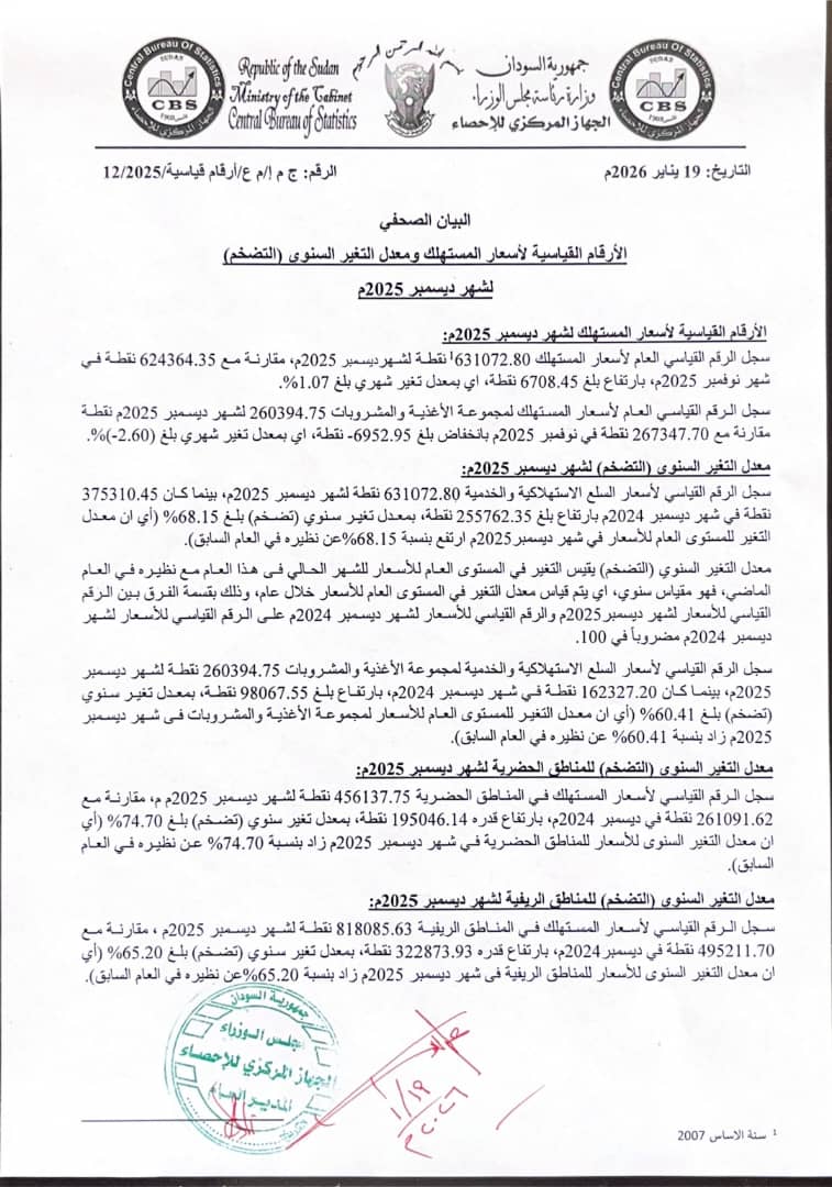 الرئيسيةاقتصادالتضخم يسجل 68% في ديسمبر اقتصاد التضخم يسجل 68% في ديسمبر 0 28 يناير 19, 2026 كتب بواسطة فريق المجد الإخباري شارك FacebookTwitterPinterestWhatsApp متابعات : المجد نيوزسجل معدل التضخم لشهر ديسمبر 2025م 68.15%، وذلك بحسب البيان الصحفي اليوم(الإثنين ) للجهاز المركزي للاحصاء. Tags#السودان#اهم واخر الاخبار المادة السابقةالبطولة الدولية للزوارق السريعة:الفرعون الاسود يحقق المركز الأولالمقالة القادمةتوضيح من الهيئة السودانية للمواصفات والمقاييس حول الفيديو المتداول بشأن ملح الطعام مقالات ذات صلة اقتصاد وآلي القضارف يؤكد علي ضرورة تدخل المصارف وتوسيع دائرة التمويل فبراير 1, 2026 اقتصاد الحجر الرملي بالقضارف… مشروع قومي يعزّز اقتصاد السودان ويعيد رسم خريطة صناعة البناء فبراير 1, 2026 اقتصاد سباق مع الزمن: حلفا الجديدة تنتفض زراعياً.. شراكات ذكية لتأمين “قمح الشتاء” يناير 31, 2026 الأكثر قراءة كلام بفلوس ... فبراير 1, 2026 أعلنت قياده سلاح المدفعيه عن تبني وتطوير الاختراع عبر منظومه الصناعات الدفاعيه ... فبراير 1, 2026 صحة الخرطوم تعلن رسمياً تشغيل(٤١) مستشفى و(٢٤٣) مركزاً صحياً بالطاقة القصوى وتتجه لتشغيل المستشفيات المتخصصة فبراير 1, 2026 أبناء الجالية السودانية في جدة يحتفلون بأعياد الاستقلال فبراير 1, 2026 تحميل أكثر احدث التعليقات