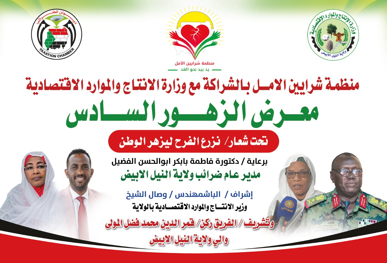 تنظم منظمة شرايين الامل بالشراكة مع وزارة الانتاج والموارد الاقتصادية المعرض السادس للزهور برعاية الدكتورة فاطمة بابكر ابو الحسن مدير عام ضرائب ولاية النيل الابيض وتشاركية استراتيجية مع وزارة الانتاج والموارد الاقتصادية المهندس وصال الشيخ محمد فرح وزيرة الانتاج والموارد الاقتصادية ورعاية وتشريف راعي النهضة الزراعية ورائد التنمية وربان السفينة الفريق قمر الدين فضل المولي والي النيل الابيض ورئيس المنظمة د محمد بردسول تبدا فعاليات المعرض يوم غد الاحد ومشاركة قطاع الارشاد الزراعي وادارة البساتين