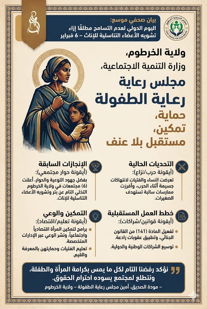 جدد مجلس رعاية الطفولة بولاية الخرطوم رفضه القاطع والمطلق لكافة أشكال تشويه الأعضاء التناسلية للإناث، مؤكدًا التزامه بحماية حقوق الفتيات والنساء، وذلك بمناسبة اليوم الدولي لعدم التسامح مطلقًا إزاء تشويه الأعضاء التناسلية للإناث، الذي يصادف السادس من فبراير من كل عام.