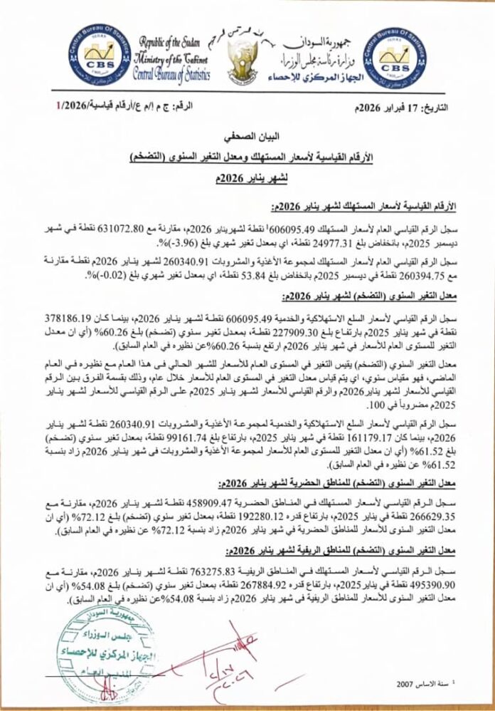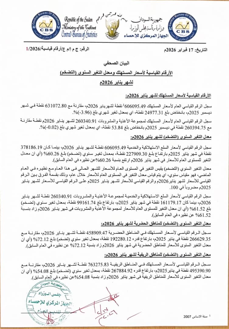 الرئيسيةاقتصادالتضخم يسجل 60% في يناير اقتصاد التضخم يسجل 60% في يناير 0 2 فبراير 17, 2026 كتب بواسطة فريق المجد الإخباري شارك FacebookTwitterPinterestWhatsApp متابعات : المجد نيوزمعدل التضخم، لشهر يناير ٢٠٢٦م 60.26%، وذلك بحسب البيان الصحفي اليوم(الثلاثاء ) للجهاز المركزي للاحصاء. Tags#السودان#اهم الاخبار والاحداث#اهم واخر الاخبار المادة السابقةالامير سعود بن عبد العزيز والقنصل العام يشرفون المهرجان الرياضي السوداني بمكة المكرمة مقالات ذات صلة اقتصاد بعد توقف دام لسنوات… انطلاقة جديدة للتكامل الجمركي المصري السوداني بروتوكول استراتيجي في القاهرة يعزز التدريب ونقل الخبرات فبراير 16, 2026 اقتصاد وصفته بالأمر الغير مسبوق: غرفة المستوردين تشيد باستجابة محافظ المركزي بإلغاء المنشور 8/2025 فبراير 15, 2026 اقتصاد تطوير وتنمية المهارات تسهم في الابداع والابتكار لجودة العمل بالنيل الابيض فبراير 14, 2026 الأكثر قراءة الامير سعود بن عبد العزيز والقنصل العام يشرفون المهرجان الرياضي السوداني بمكة المكرمة فبراير 17, 2026 رئيس مجلس إدارة فندق الدوحة السياحي يهنئ مواطني محليتي حلفا الجديدة ونهر عطبرة بحلول شهر رمضان المبارك 🌙 فبراير 17, 2026 افتتاح الفرع الرئيسي لـ بنك النيل بأم درمان فبراير 17, 2026 وجه الحقيقة المفتاح السوداني.. ... فبراير 17, 2026 تحميل أكثر احدث التعليقات