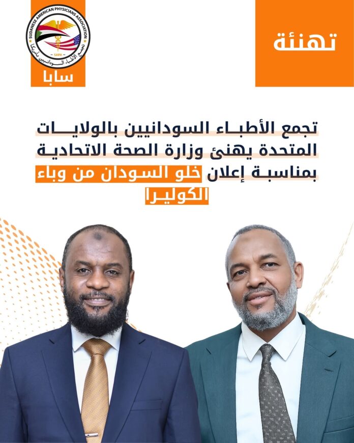 هنأ تجمع الأطباء السودانيين بالولايات المتحدة الأمريكية (SAPA) وزارة الصحة الاتحادية ووزير الصحة الاتحادي البروفيسور هيثم محمد إبراهيم بمناسبة إعلان خلو السودان من وباء الكوليرا، واصفاً الخطوة بأنها إنجاز صحي مهم تحقق رغم التحديات والظروف الاستثنائية التي تمر بها البلاد.