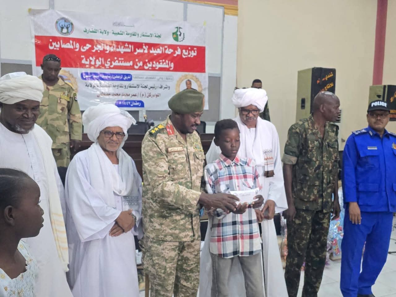 جاء ذلك خلال مخاطبته اليوم بقاعة بلدية القضارف برنامج توزيع فرحة العيد لأسر الشهداء والجرحى والمصابين والمفقودين الذي نفذته المقاومة الشعبية بالولاية بدعم من حكومة الولاية والمقاومة الاتحادية ومنظمتي الشهيد والايثار وديوان الزكاة.