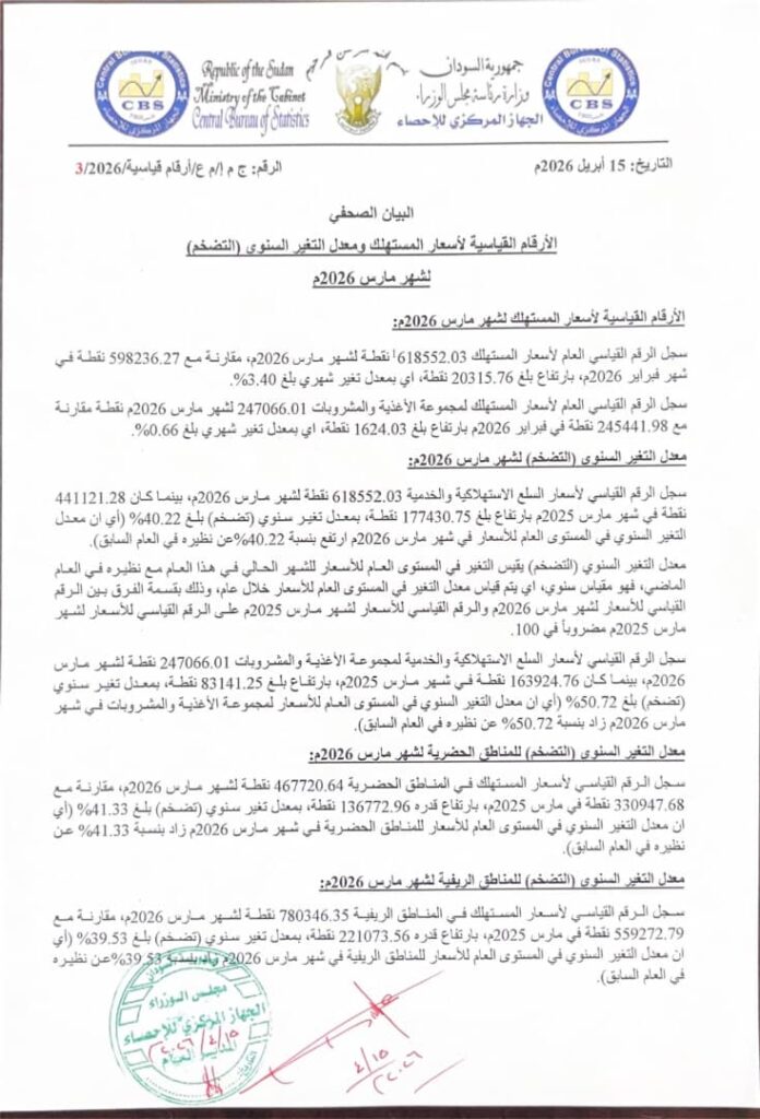 الرئيسيةاقتصادمعدل التضخم يسجل ٤٠% اقتصاد معدل التضخم يسجل ٤٠% 0 10 أبريل 16, 2026 كتب بواسطة فريق المجد الإخباري شارك FacebookTwitterPinterestWhatsApp متابعات : المجد نبوزسجل معدل التضخم لشهر مارس ٢٠٢٦م ، ٤٠.٢٢%، بحسب البيان الصحفي للجهاز المركزي للاحصاء.. Tags#السودان#اهم الاخبار والاحداث#اهم واخر الاخبار المادة السابقةقطوف/ بقلم .. انتصار فضل الله : النقل النهري بين التنظيم والمخاطر… لماذا تمثل الآلية الجديدة فرصة لإنقاذ الأرواح؟المقالة القادمةاستيراد التضخم في السودان .. أرقام تحكي قصة الغلاء ودور السياسات الاقتصادية كتب: أبوعبيده أحمد سعيد محمد مقالات ذات صلة اقتصاد انطلاق دورة شهداء الكرامة بالبطانة في 20 أبريل الجاري أبريل 16, 2026 اقتصاد المالية تؤكد حرصها الحكومة على تعزيز علاقات التعاون مع الجزائر أبريل 15, 2026 اقتصاد إطلاق خدمة (صح) للتحويلات المالية أبريل 14, 2026 الأكثر قراءة إبادة 28 طناً من الأغذية الفاسدة بولاية كسلا أبريل 16, 2026 انطلاق دورة شهداء الكرامة بالبطانة في 20 أبريل الجاري أبريل 16, 2026 الوقود يشعل الأسواق: قفزة في أسعار الخضروات والفواكه بحلفا الجديدة أبريل 16, 2026 شراكة حكومية لضبط النقل النهري… تدشين آلية مشتركة للسلامة ومناشدة للمواطنين بالالتزام. ... أبريل 16, 2026 تحميل أكثر احدث التعليقات